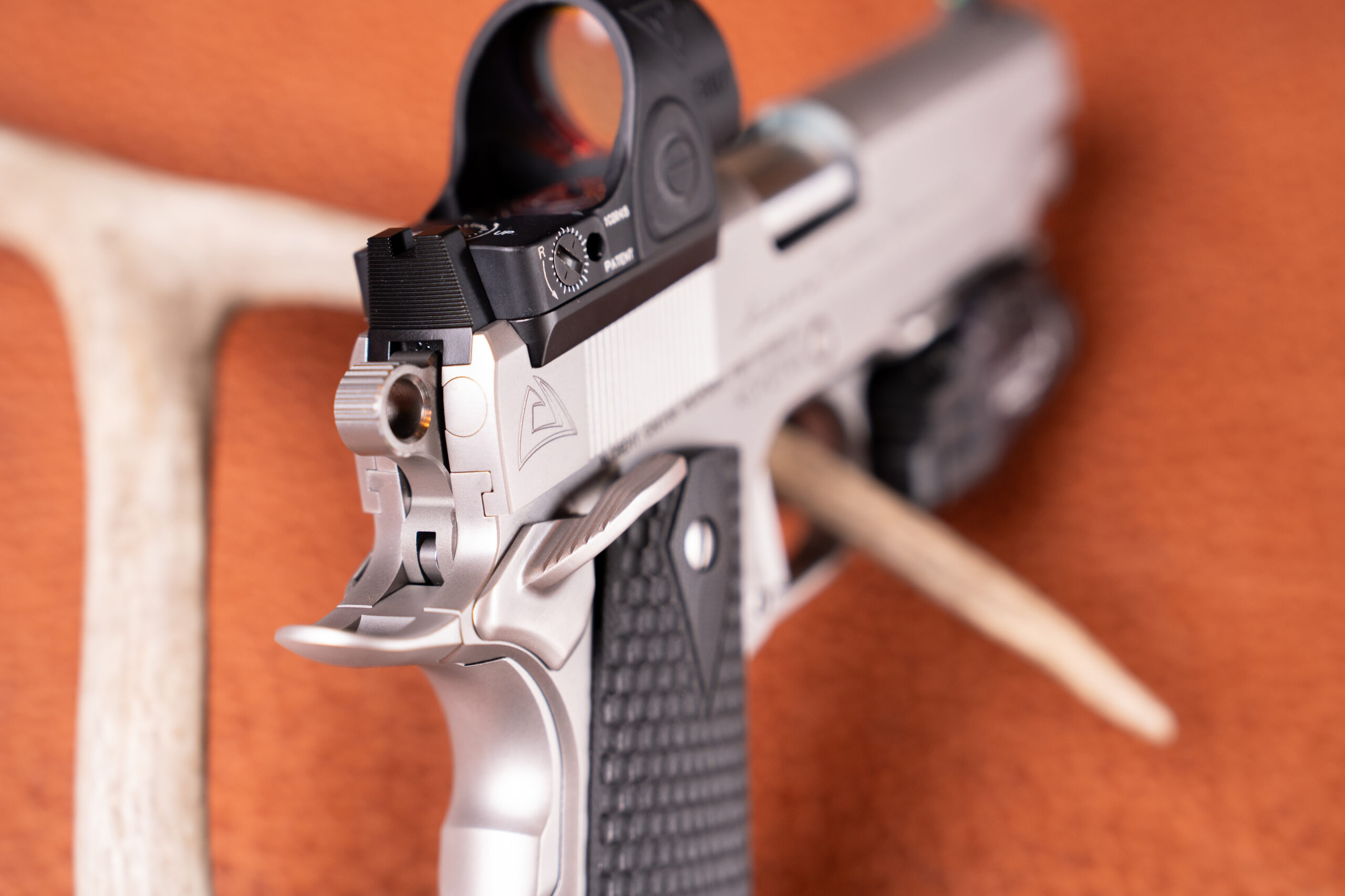 Sights consist of an ACW fixed rear sight with serrated sight picture and tritium front sight for fast, reliable acquisition in any light. The slide is machined with an ACW red dot mount (adapter plate fits full-size Trijicon RMR/SRO and Holoson MRDS only — red dot not included) for optic-ready versatility. Additional premium details include checkered double diamond G10 grips, traditional-style billet spring guide and cap, two 8-round magazines, and a documented 1.5″ accuracy guarantee at 25 yards.